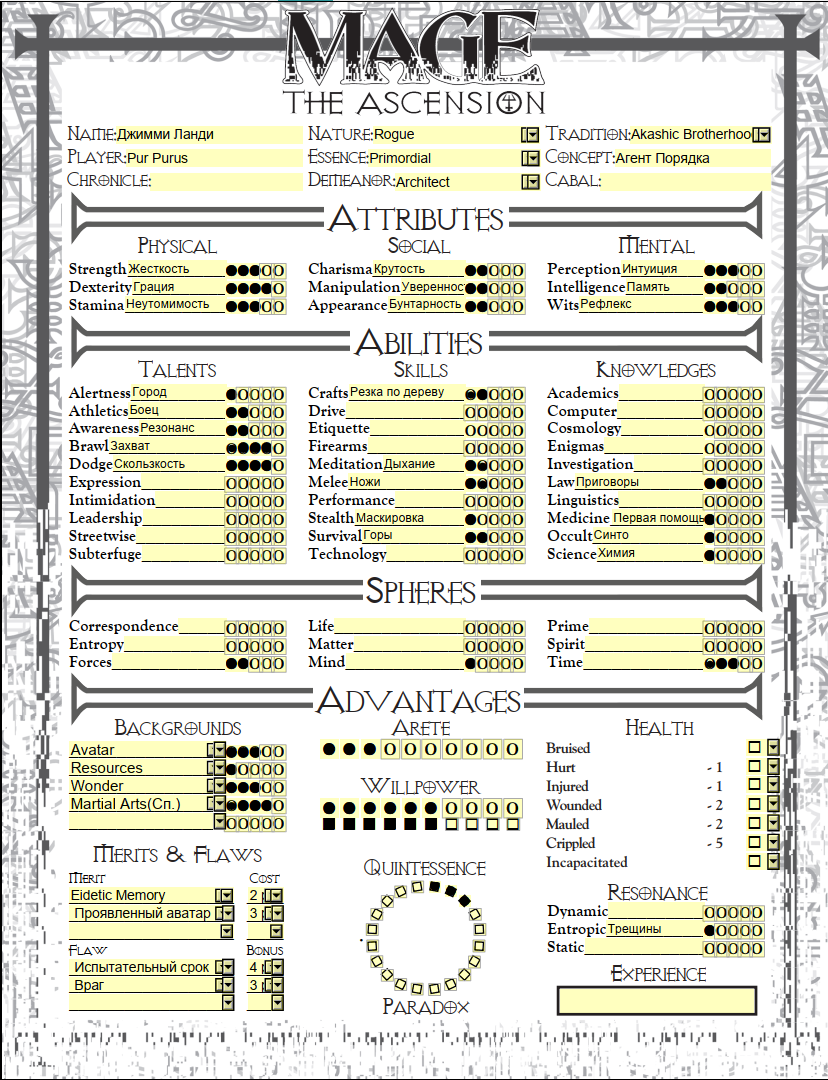 Французский акашит с замашками панка. Носит солнечные очки везде, даже в здании(кроме додзе), и скрипит своей кожаной курткой даже в самую жаркую погоду - потому что это круто. Увы, в отличие от настоящих панков не воняет - сенсеи все еще пытаются наставить его на До, а потому он соблюдает примерный образ жизни и пытается вникнуть в философию своего братства.