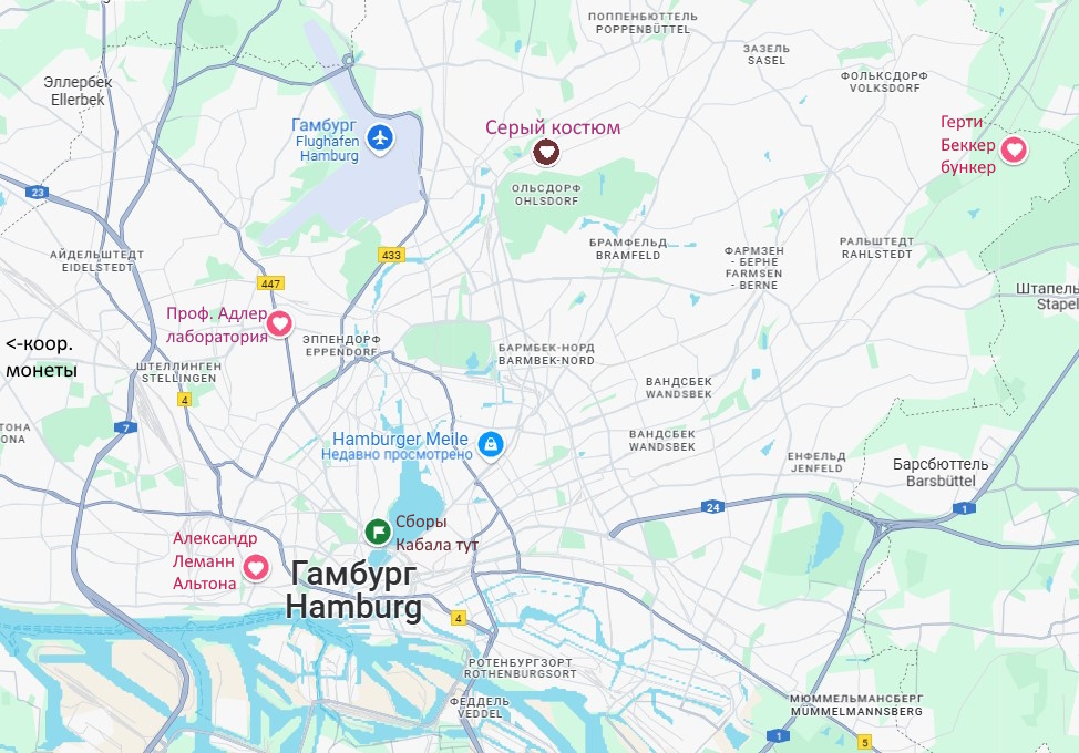 У безымянного покойника какая-то связь с Технократами будто: те самые серые костюмы, под окнами какое-то время ошивался фургон, квартира выглядит конспиративной. В одном из пиджаков была найдена монета с шифром, ГРЛ над ним работает. Шифр выдал географические координаты на западе Гамбурга